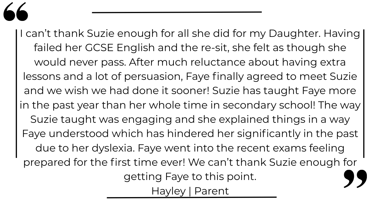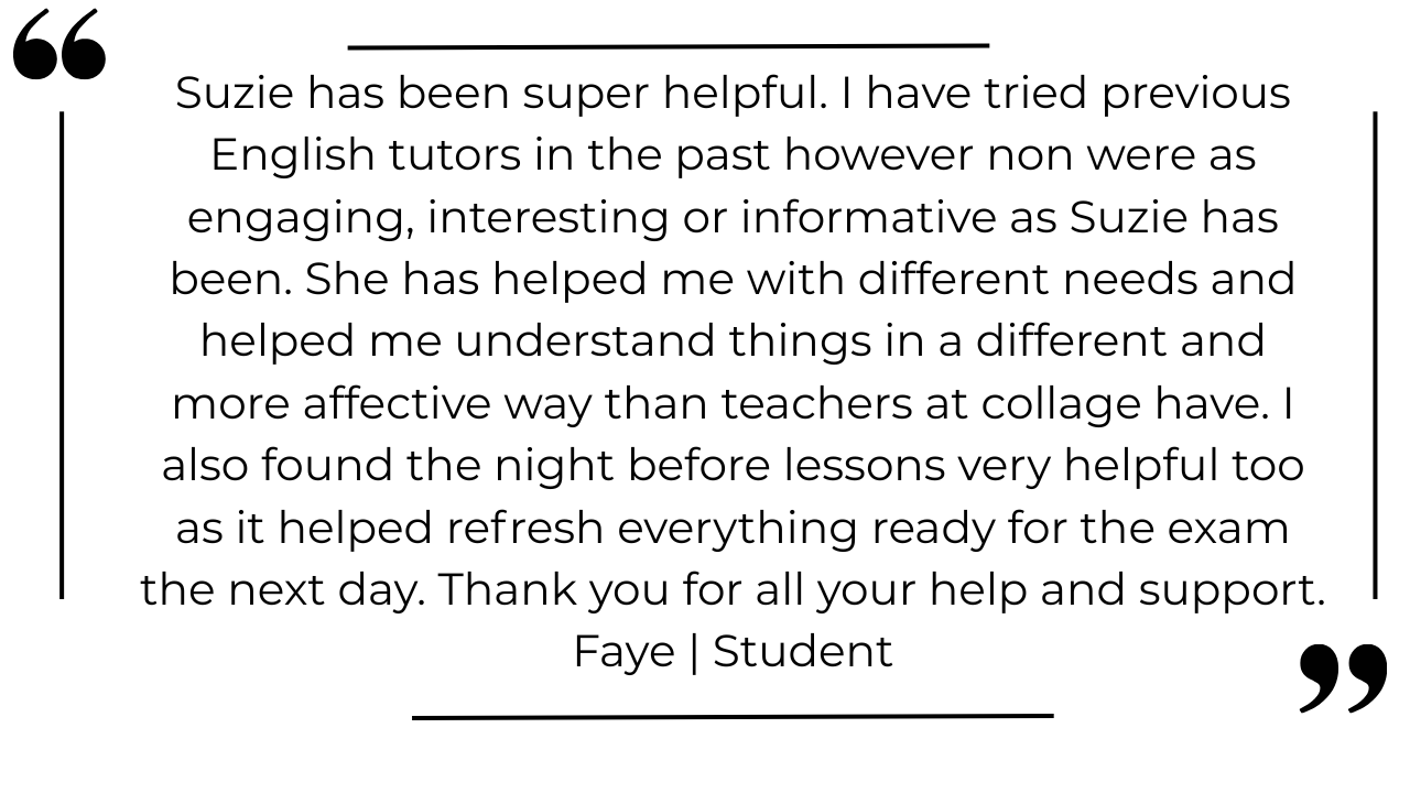 My knowledge of the exam specification is exceptional, and I am incredibly confident that I can guide students through their GCSE examinations in English literature and language, giving them the positivity they need to tackle any question and know they can hit the high marks.